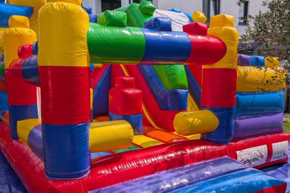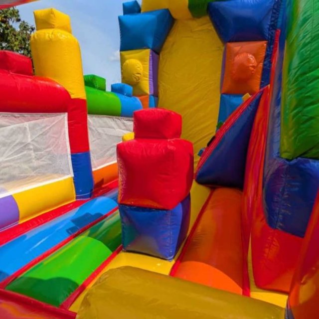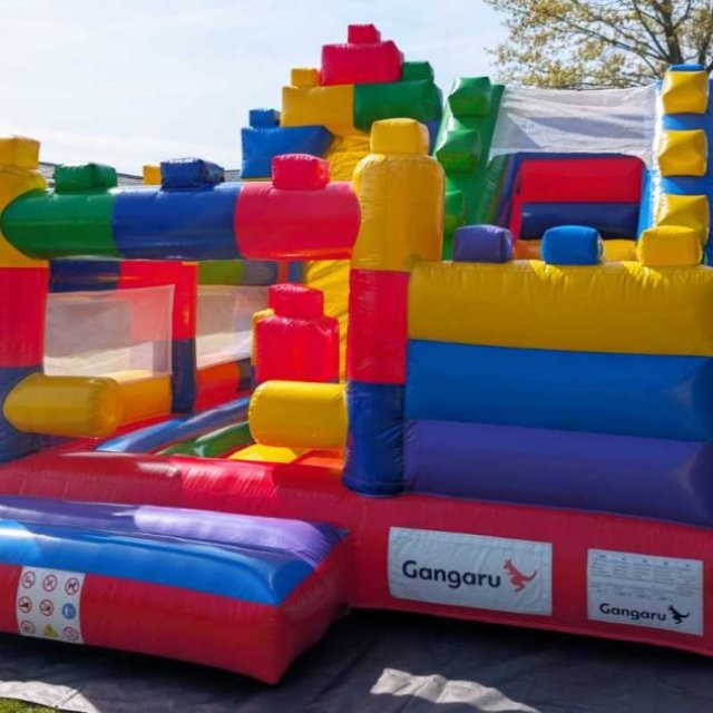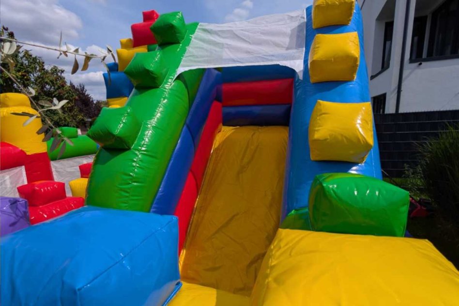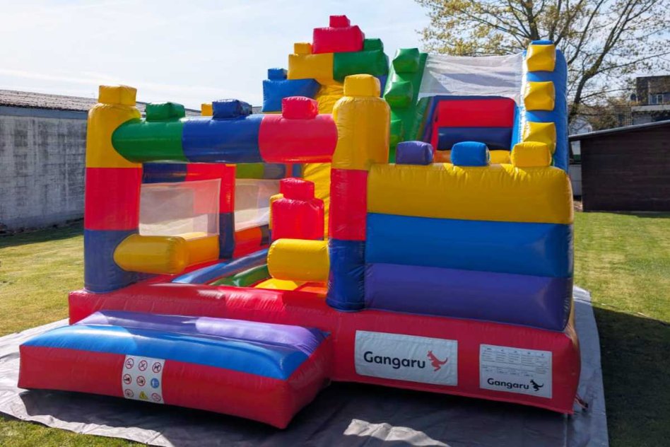 Unsere Baustein-Hüpfburg mit Rutsche bietet auf 4 x 5 Metern Fläche Platz für bis zu 10 Kinder.